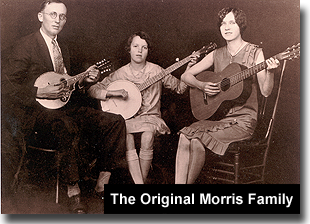 The Carter Family had a tremendous influence on us, according to Fanny Lou Morris Ringeisen, member of the original Morris Family. The new country releases encouraged our family to work at their music and songs. The Morris Family began their playing and singing, as with many others of the era did, within the influence of their warm home and church environments, in and around Lumpkin County, Georgia. Since the family patriarch was also a minister of the gospel, this made their brand of homestyle pickin' and singin' extra special. Joining in at the old time singing conventions provided a wealth of experience for the family. At that time, the Morris Family band included Rev. Frank Morris, who played the mandolin, Fanny Lou Morris Ringeisen, who played the guitar, and Girlie Jean Morris who played the banjo. |